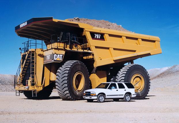El camión más grande del mundo es un dumper fabricado por Caterpillar, pesa más de 200 toneladas, es capaz de transportar 320 toneladas, mide siete metros de altoy ocho de ancho. Tiene un depósito de 4000 litros de diesel y sus ruedas miden más de tres metros de altura. Solo hay 25 camiones de estos en todo el mundo y son trasladados por partes ya que son demasiado grandes para caver en una autovía.